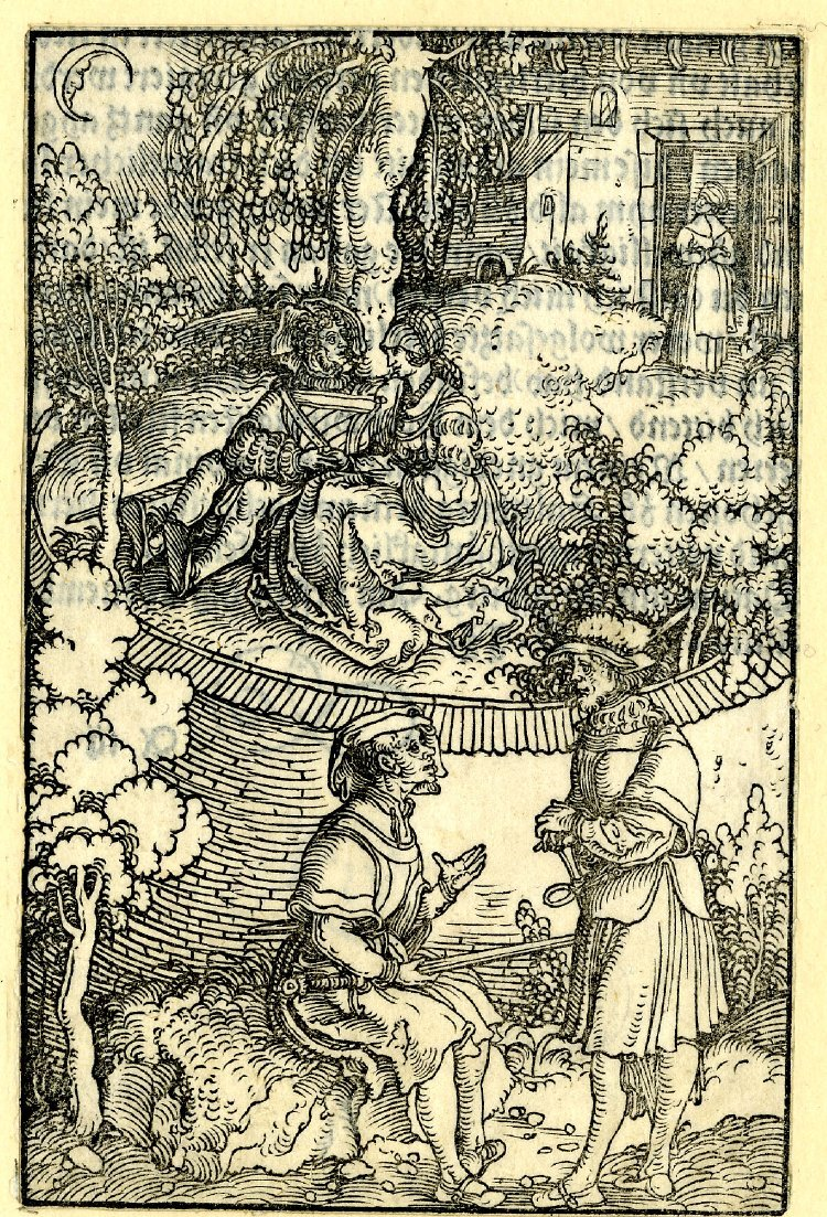 This image shows five characters: Calisto and Melibea sitting under a tree in the midground, Lucrecia in the background, and Sosia and Tristan in the foreground. Calisto, Melibea, and Lucrecia are within the walls of Melibea’s garden. Sosia and Tristan are standing guard outside the garden wall while Calisto and Melibea talk and hold hands. The moon in the upper left corner indicates that the scene is taking place at night. Lucrecia is standing in the background, waiting from a distance for Melibea to conclude her rendezvous with Calisto.