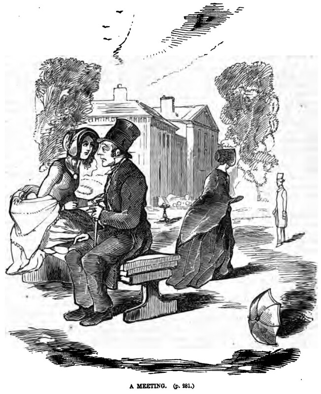 John Sedley sits on a bench in the park, holding onto his cane. Next to him is his daughter, Amelia Osborne, holding onto his arm. Mary Clapp, also in a shawl and bonnet, is standing facing away from them. In front of her is William Dobbin, who she has brought to meet the pair. On the ground near the bench is a small, open parasol or umbrella, and in the background two houses are behind a fountain and between some trees. Below the illustration is printed its title and location in the story, “A MEETING. (p. 281.)”.