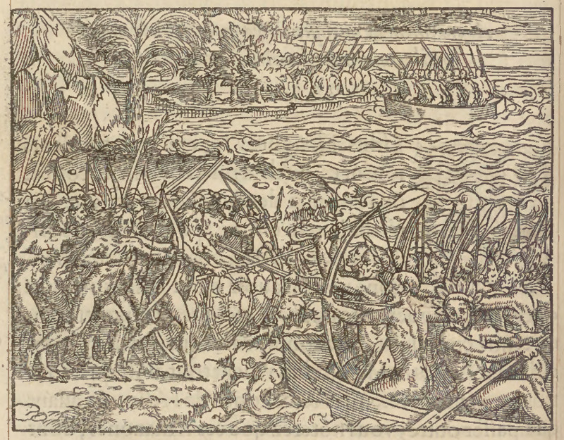A group of Indigenous Brazilian woman, called ‘Amazons’ by the author, fight against a group of Indigenous Brazilian men who attack from the water. The women fight with bows and arrows, spears and shields, while the men in canoes use bows and arrows and clubs. The women are unadorned with their hair worn unbound. Some of the men wear feathered headdresses.