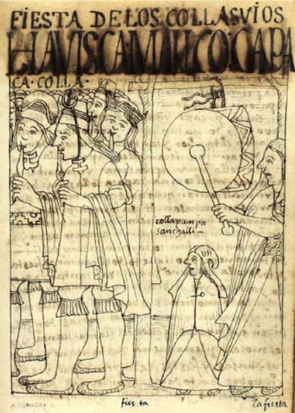 This chapter is dedicated to discussing the various celebrations and festivals that would be held in the Inca Empire. This image depicts the celebrations held in the Collasuyo region in the Inca Empire. There is a figure on the right side of the image playing a large drum hanging from a wooden post with a child standing beside them. There is a large crowd of people illustrated on the left side of the image taking part in the festivities. Some figures are illustrated with flutes in their mouths as they play music. There is a caption written under the drum which reads “colla pampa/sanchalli” [the plateau in that quarter/in Sanchalli].