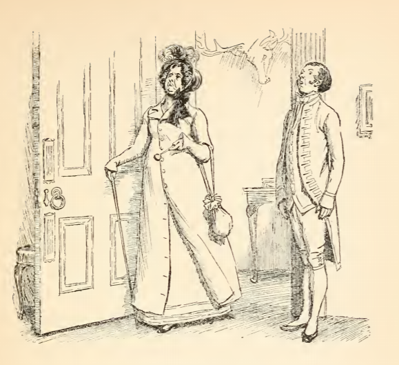 In this image Lady Catherine de Bourgh walks into Longbourn. Lady Catherine came to Longbourn to discuss the rumours that Mr. Darcy was going to propose to Elizabeth. Lady Catherine wanted Elizabeth to deny the rumours and promise not to accept his proposal should he offer one. This is because Lady Catherine wanted Mr. Darcy to marry her daughter instead. Elizabeth refused Lady Catherine’s request, saying that if Mr. Darcy proposed she would happily accept. This infuriated Lady Catherine and she left in anger. This scene occurs in chapter 56. The characters are shown in the traditional regency style. Lady Catherine wears a regency dress with an empire waistline. She wears an overcoat and a bonnet and carries a purse and walking stick. The regency period dated to the early nineteenth century (1811-1820) when George, Prince of Wales, later George IV (r. 1820-1830), reigned as regent for his mentally ill father, King George III (r. 1760-1820). The regency period is associated with the rise of neoclassicism in art and fashion.