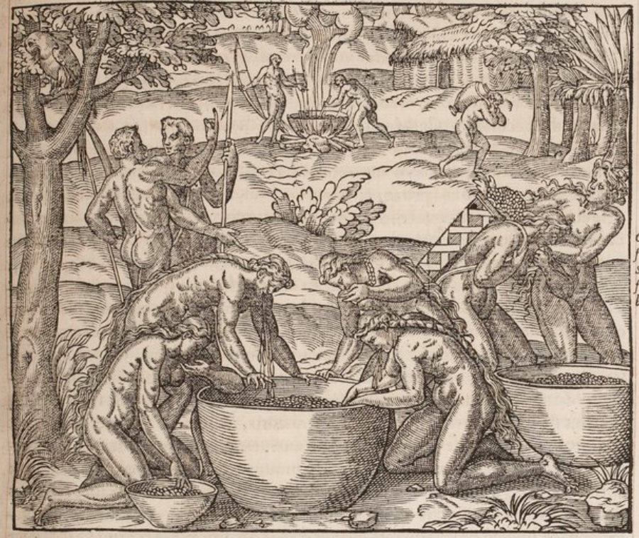 A group of Indigenous women crouch around large pots on the ground. They chew roots (manioc/cassava) and then spit them into the vats, after which the concoction is boiled and strained. A woman by the pot on the right carries a large basket on her back full of more roots. Two men, one holding a bow and the other a spear, stand talking just behind the women. In the background, two people tend a large pot over the fire where the beverage is being boiled. Another individual walks by carrying a large container on their back. One structure is also visible in the background. This image is identical to one found on page 917 of Paris 1575 (l’Huillier).