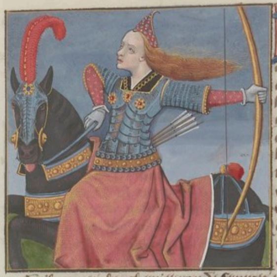 This illumination depicts Penthesilea, the queen of the Amazons, riding a horse while pointing her bow behind her. Penthesilea, as Boccaccio describes, was a great warrior. She wanted to secure a strong heir for the Amazons, so she sought out Hector of Troy to provide her with an heir. She fought in a battle against the Greeks to prove herself worthy of bearing Hectors child. She died in battle trying to impress Hector.