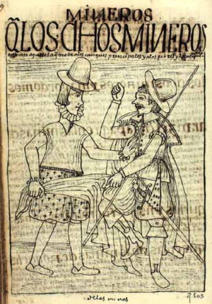 This image is illustrated in a chapter that discusses and criticizes the government and society in Spanish conquered Peru. This image depicts a judge on the right side of the image robbing a noble indigenous man on the right side of the image. He appears to be taking a cloak from him. These judges were sent by Spanish mine owners to rob indigenous peoples of noble and lower status. The author criticizes the mine owners as they disrespected, abused, overworked, and took advantage of the indigenous peoples who worked in the mines. The caption at the bottom of the image reads, “de las minas” [from the mines].