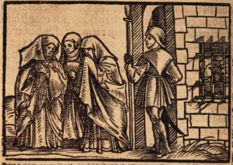 The engraving depicts a man guarding a jail with figures visible through the window of the prison cell, and three figures leaving the jail wearing heavy garments. The three figures leaving the jail are Minyan men who had been sentenced to death for their crimes against their city. Boccaccio explains that the Minyans wives had gone into the jail and swapped clothing with their husbands and switched places with them. The men in disguises slipped past the guards unnoticed and into freedom, while their wives were executed in their place. Boccaccio explains that he chose to write on these women to demonstrate that there is no greater love than a wife’s love for her husband.