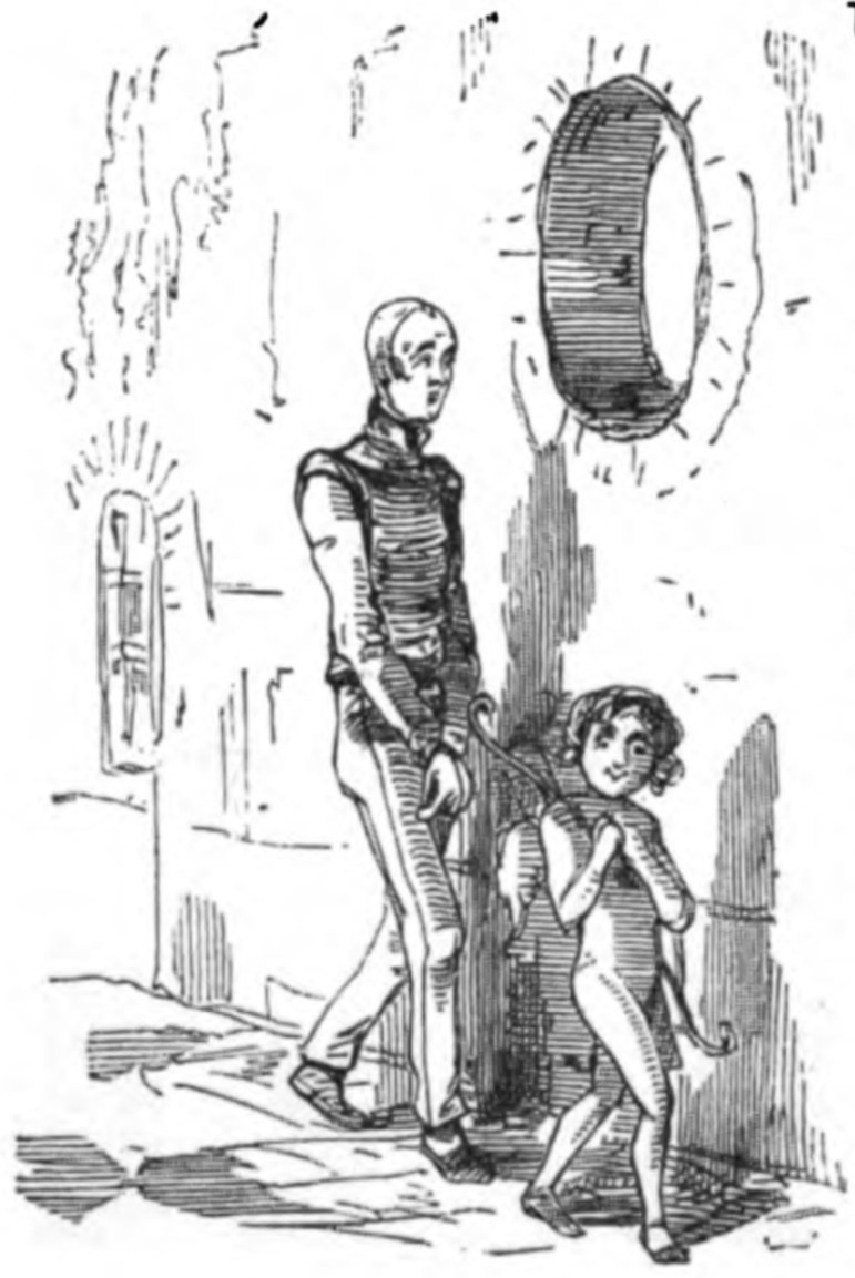 William Dobbin walks along a path next to a high, thick wall - possibly the side of the boat - looking shy with his hands clasped in front of him. He is led by a child in the appearance of a cupid, with small wings and a bow. A window high up in the wall forms the letter O from “Our”.