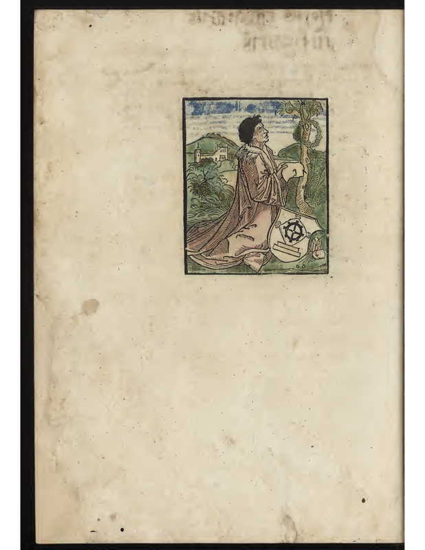 Sebastion Brant kneels under a tree with a wreath around it in the woods holding what could potentially be parchment and wearing a robe. Beside him is a shield with an insignia that resembles a gear. In the background a castle can be seen