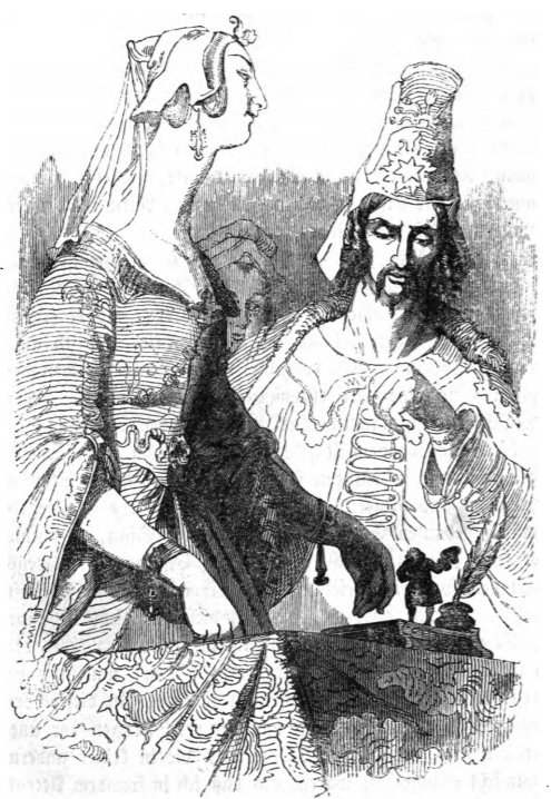 In this image we see Gulliver speaking with the king and queen of Brobdingnag. On the left is the queen who wears a long, embroidered dress and a headpiece with a veil and long earrings. The king in on the left and wears an embroidered tunic and a tall headpiece that is embroidered with a six-pointed star. Another woman stands behind the king and queen. Gulliver stands on a writing desk next to a quill in an inkwell. His hat is in his hand as he bows to the King and Queen. The same image appears in the 1839 Krabbe edition.