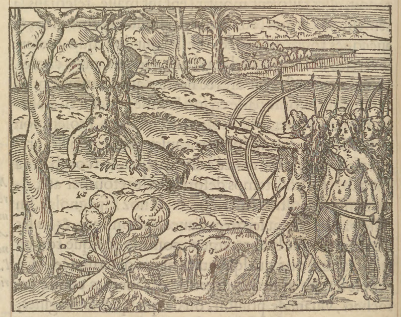 Two men have been captured by the Indigenous Brazilian warrior women, a group which the author calls ‘Amazons’. The men have been hung upside down by one ankle from a tree, and a fire has been lit beneath them. The women shoot arrows at the hanging men.