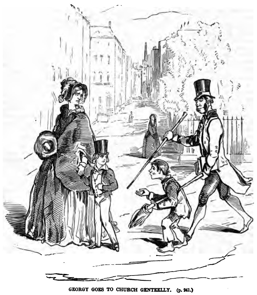 Georgy Osborne in a top hat and suit, holds onto his aunt Jane Osborne’s hand, and is turned to face the boy who has come up behind him. The boy is a young sweep, barefoot and with ragged clothes, begging for money. The footman, carrying the church books, is behind the sweep, trying to drive him away with a cane. In the background is Amelia Osborne, who was going for a walk on the cross-street to the one the others are taking to church, watching proudly as her son gives money to the sweep. Below the illustration is printed in cursive its title, “GEORGY GOES TO CHURCH GENTEELLY. (p. 241.)”.