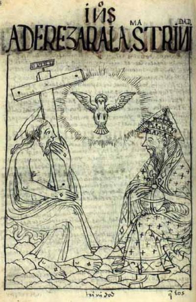 This image depicts the Holy Trinity, the Father, the Son, and the Holy Spirit. God depicted as the Father is sitting on the right side of the image wearing a long, decorated robe as he holds an orb which symbolizes the Earth. He is also wearing a triangular halo which represents the Holy Trinity. Jesus Christ, the Son, is illustrated sitting on the left side of the image holding the cross that he was crucified on. There are nail marks on the cross and on his hands and feet, and a puncture wound below his right breast which was stabbed by the holy lance. The letters written at the top of the crucifix spell “I.N.R.I” [Iesus Nazarenus Rex Iudaeorum/Jesus of Nazareth King of the Jews]. The Holy Spirit is represented through the dove that is in the centre of the image. There are clouds beneath the feet of Christ and God which demonstrates they are in Heaven. The caption at the bottom of the image reads, “trinidad” [trinity].
