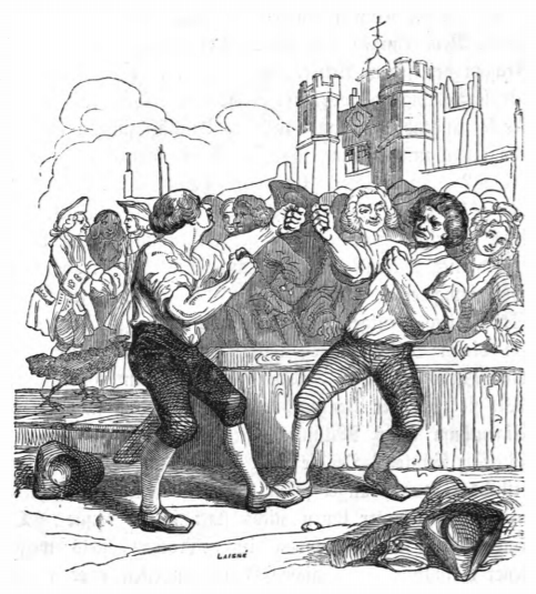 Here we see two men fist fighting in the street, while a crowd watches from behind a short wall. Their hats and coats are on the ground. In the background we see a large castle, and a rooster. In this chapter Gulliver talks with the king of Brobdingnag about English traditions. Gulliver tells the king about diplomacy, religion, the justice system, the arts, the financial system, and the nobility, then debated these issues with the king. This image comes when Gulliver is discussing the judicial system. The same image appears in the 1839 Krabbe edition.