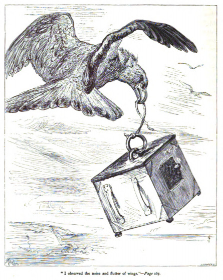 Here we see an eagle carry Gulliver’s house away from Brobdingnag. Gulliver leans out the window to see what was going on. The eagle picked up Gulliver’s house and carried out over the water. The eagle eventually dropped the house and Gulliver was rescued by a nearby ship.