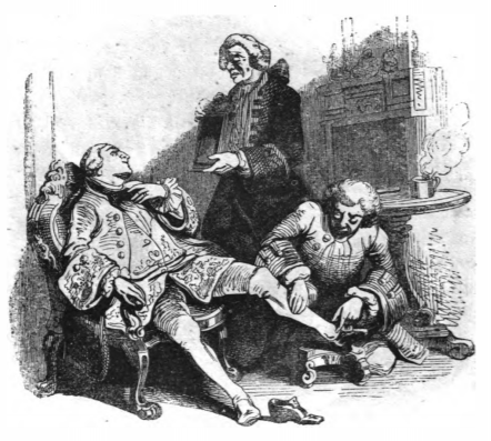 Here scholars on Lilliput debate philosophy. Gulliver says that they do not have the same approach to philosophy as Europeans. He says that Lilliputians do not use Aristotelian categories, but is instead based on infallible principles, and imagining oneself as a member of another class. Thus, here we see two well-dressed men acting as servants to the third. This image comes in the appendix to Gulliver’s travels to Lilliput. The same image appears in the 1843 Krabbe edition.