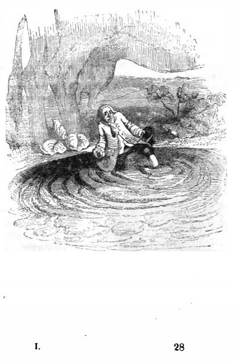 Here Gulliver walks through cow-dung. While walking outside, Gulliver came across cow excrement and tried to jump over it. He missed and landed in the middle. He then waded through it and was picked up by a footman who wiped him off and carried him until they returned home. The same image appears in the 1839 Krabbe edition.