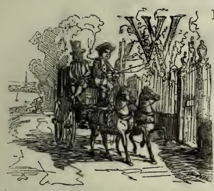 A coach drawn by two horses, driven by a coachman in a three-cornered hat. Beside him sits Sambo, the footman. On the right side of the image is the gate to Miss Pinkerton’s academy for young ladies, at which the coach has just arrived. In the background there are two trees and a building. In the top right of the image is the letter W, from “While”.
