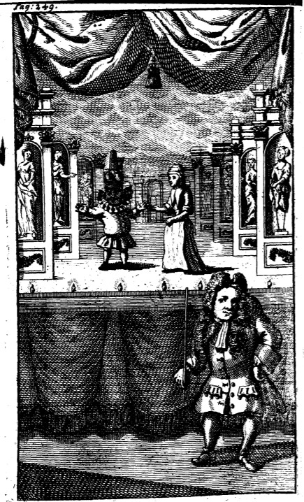This image is a depiction of a court scene from Gulliver’s Travels, likely in the land of Glubbdubdrib. The image is of a stage, with curtains along the top of the image, and lights lining the bottom of the stage, denoting the difference from the stage and the man, likely Gulliver, who observes the king and a courtier on the stage. A wall separates Gulliver from the other characters. Statues in the Classical or Neoclassical style line the walls of the hall, with stairs at the back leading to a throne. The image in this edition is the same as that in the 1728 German von Wiering edition.