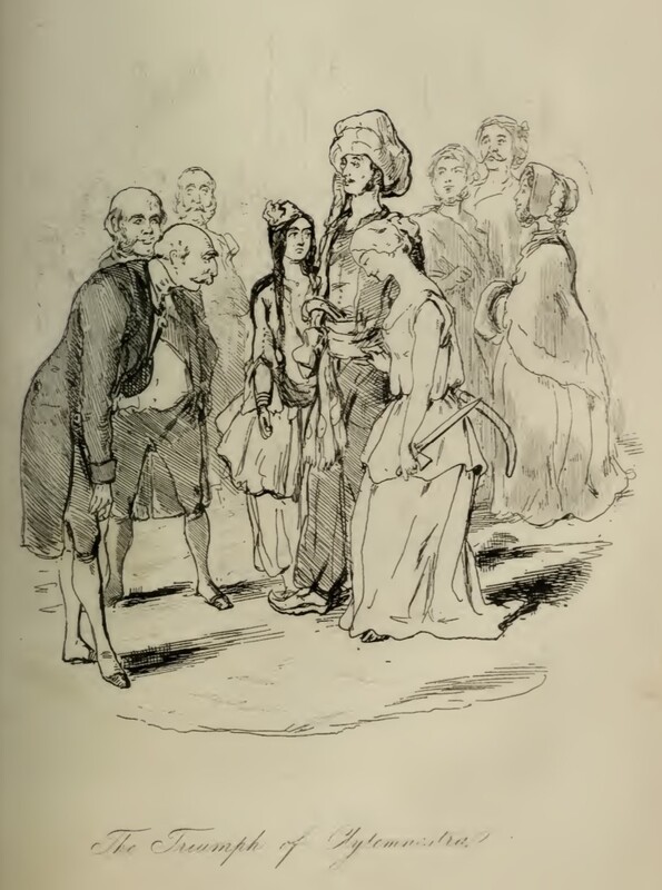 Rebecca Crawley, dressed in a toga and holding a dagger in the character of Clytemnestra, curtseys slightly to his Royal Highness, the prince of Peterwaradin, as he bows and compliments her performance. Next to her is Mr. Bedwin Sands, dressed as a Turkish officer, and behind him Mrs. Winkworth, whose performance as Zuleikah had been the focus of admiration prior to Becky’s appearance. Between Mrs. Winkworth and the prince of Peterwaradin is Lord Steyne, smiling jovially. In the background are several other admiring partygoers. Below the illustration is printed in cursive its title, “The Triumph of Clytemnestra”.