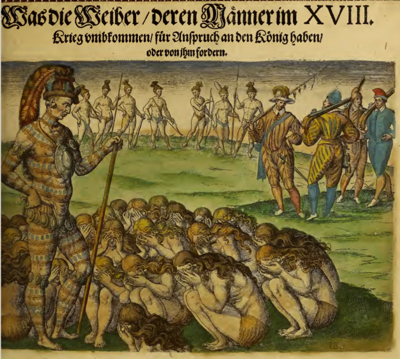 A group of Indigenous women crouch close to the ground with their hands covering their faces, in front of the chief. The chief wears a headdress with a large feather and animal tail hanging from the back, a round plate against his chest, a loincloth with small ovals hanging from it, and jewelry featuring the same small ovals around his upper arms and below his knees. His body is covered in designs, and he gazes down at the woman. In the background, a group of settlers stand together holding rifles. To the left of the group, a group of Indigenous men stand holding bows and arrows and clubs. This illustration is identical to the one found on page 71 of Frankfurt 1591, but colored.