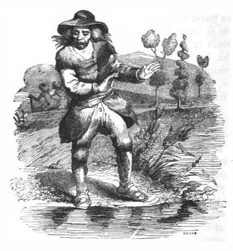 During his time on the Country of the Houyhnhnms, Gulliver began to hate all humans, because he viewed the Houyhnhnms to be superior beings, while the yahoos were inferior. It got to the point where Gulliver began to hate his own reflection because he looked like the yahoos. This sentiment stuck with Gulliver even after he returned home to England, and he could never look at a human the same way. The same image appears in the 1839 Krabbe edition.