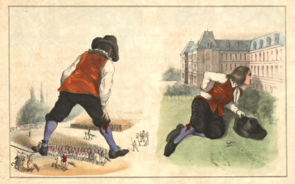 This image contains two scenes taken after Gulliver was granted his freedom. On the left side we see Gulliver standing as a triumphal arch for a military procession. After Gulliver agreed to the terms of his freedom, the Emperor of Lilliput requested that Gulliver stand with his legs apart acting as an arch for a military procession. The procession included three-thousand men on foot and one thousand cavalry members. On the right-side Gulliver lies on the ground looking in the window of the imperial palace. He was impressed by the splendor of the palace and saw the Queen and her sons inside the palace.