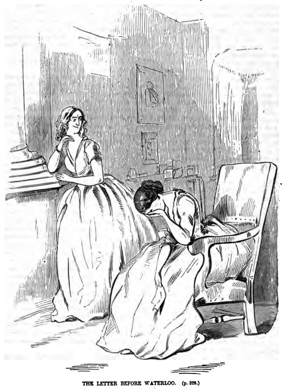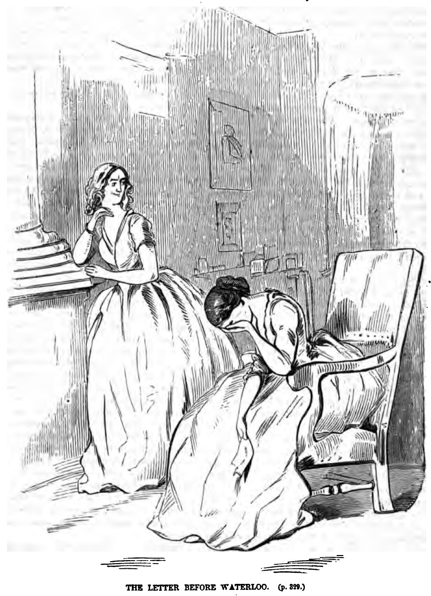 On the left, Rebecca Sharp is standing against a column and looking to the right towards Amelia Sedley, who sits crying in a chair with one hand over her face. In her other hand she holds the letter which her husband gave to Becky in Chapter XXIX, asking her to run away with him. In the background can be seen two pictures on the wall, a dresser with various objects placed upon it, and part of the canopy of a bed. Below the illustration is printed its title and location in the story, “THE LETTER BEFORE WATERLOO. (p. 329.)”.