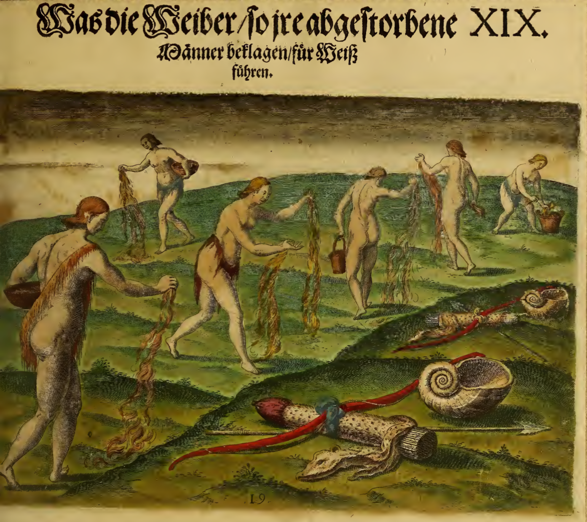 Several Indigenous women are shown scattering a substance, possibly leaves or a grass, onto the ground. The women are mostly nude, although some wear a light skirt of grass tied around their waist. This illustration is identical to the one found on page 73 of Frankfurt 1591, but colored.