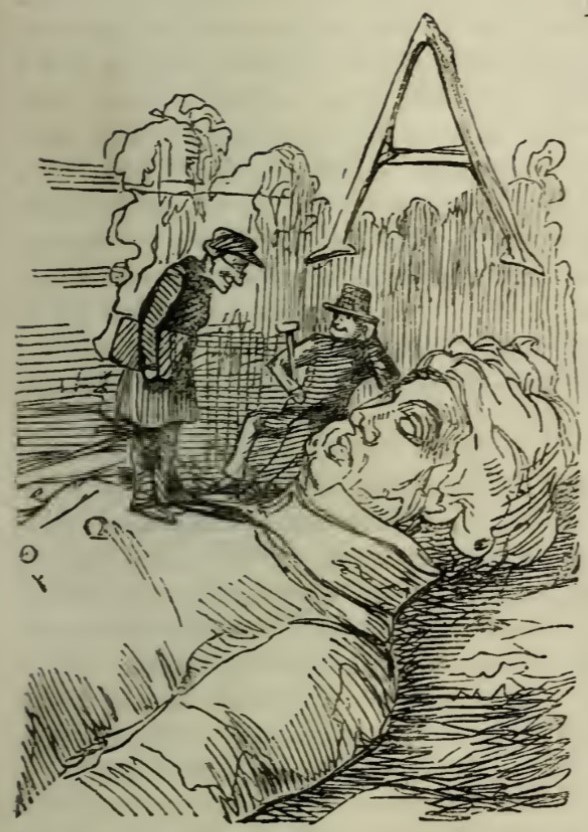 A sleeping giant lies on the ground, large enough that only his head and the upper half of his torso are visible in the picture. A man in glasses stands on the giant’s chest, observing his face. Another man, carrying a mallet, leans against the side of the giant’s face. Above their heads is the letter A, from “After”.