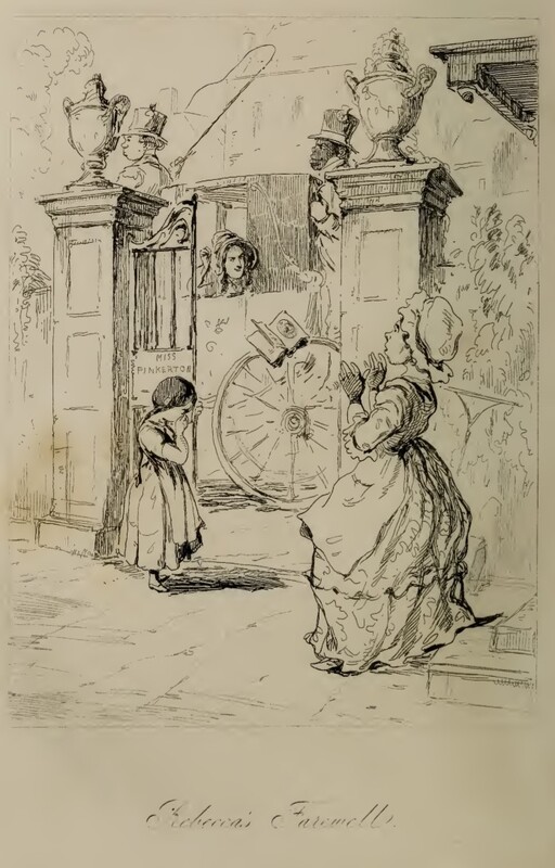 The image depicts two pillars topped with cups, between which is an open gate with a plate reading “Miss Pinkerton”. The pillars frame a carriage with very large wheels, at the front of which sits the coachman, holding his whip, and at the back of which stands Sambo. Rebecca Sharp’s face can be seen from the window of the carriage as she flings a book at the surprised Miss Jemima, who stands on the right side of the image at the bottom of the stairs. Next to the left pillar is a young girl with long braids, possibly Laura Martin, crying and covering her face with her hands. Below the illustration is printed in cursive its title, “Rebecca’s Farewell”.