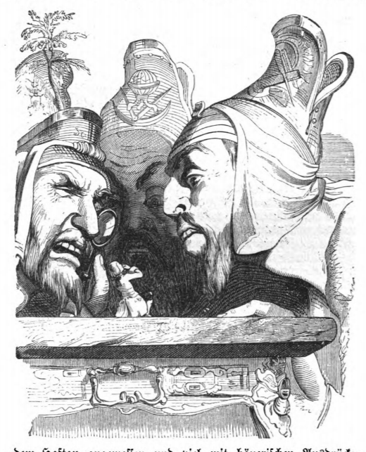 In this image we see Gulliver being examined by three scholars from Brobdingnag. The scholars were invited by the King to examine Gulliver’s ‘physical form’. They came to the conclusion that he did not conform to the ‘usual course of nature’, as he was significantly smaller than any other creature on Brobdingnag. They also questioned him regarding his diet and his education. There are three giants crowded around Gulliver who is standing on a table. They each wear elaborate hats and have beards. The giant on the left holds a magnifying glass to his left eye. His hat has what looks like a tree and an insect on top. The centre giant’s face is somewhat in shadow, and his hat has an image of a compass and a globe. The man on the right has depictions of scientific instruments on his hat. Gulliver is seated on a table that is elaborately carved and looks up at the giants. The same image appears in both the 1839 and 1843 Krabbe editions.