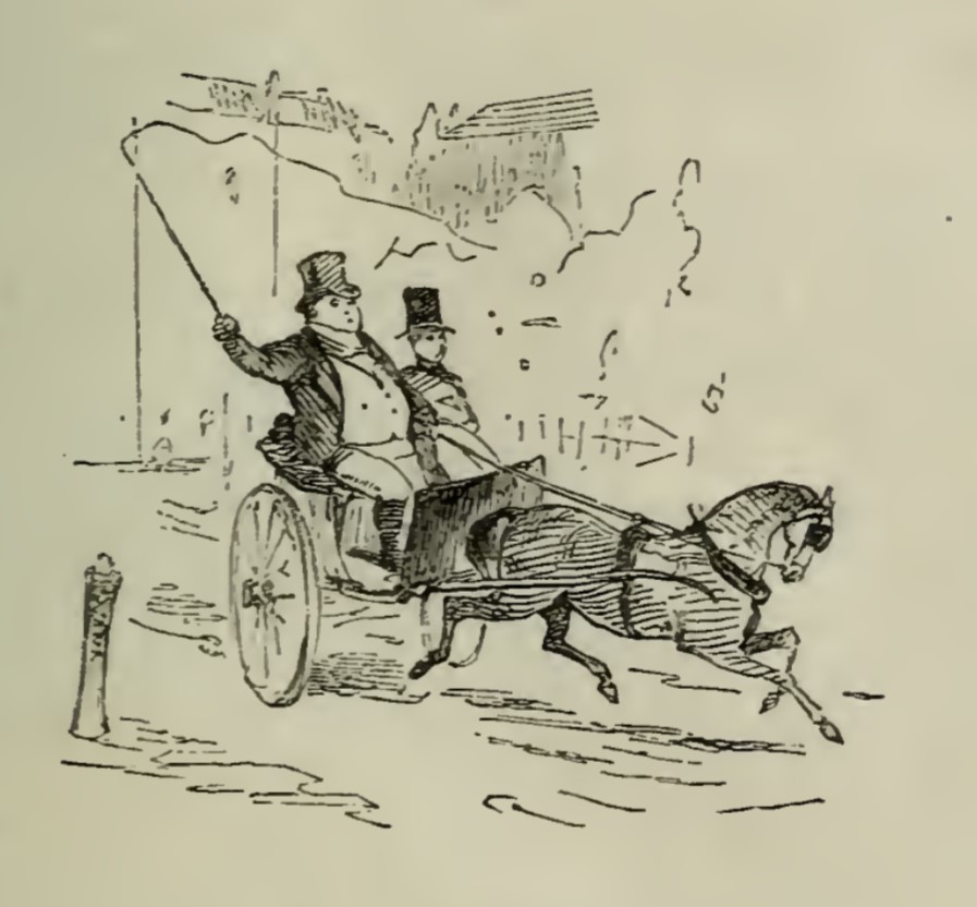 Joseph Sedley is seated in a small, open, two-wheeled carriage pulled by a single horse. He holds the reins in his left hand with the whip raised high in his right as the buggy passes a post. At his side is seated another, unspecified, male figure in a tall hat. In the background can be seen the outside of some trees and two buildings.