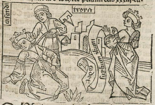 This engraving depicts Cassandra, the daughter of king Priam of Troy on the left side of the engraving being killed under the order of Clytemnestra, who is on the right side of the engraving watching the murder. Boccaccio explains that Cassandra was brought to Mycenae after the Trojan War as king Agamemnon’s concubine. Agamemnon’s wife, Clytemnestra did not like this, and ordered Cassandra to be killed. Cassandra is depicted with a rope around her neck and a man pulling on the rope. Clytemnestra is depicted with a pleased look on her face as she watches Cassandra die. Cassandra’s name is engraved in the top left corner of the engraving to identify her. The fallen city of Troy is depicted in the background of the engraving.
