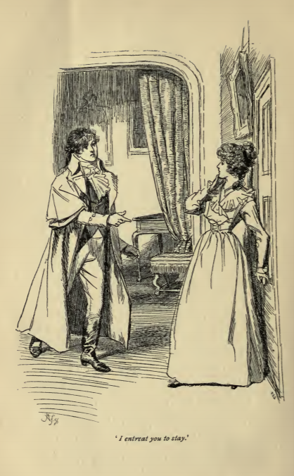In this image Willoughby begs Elinor to listen to him. He heard of Marianne’s illness, and he had come to tell her that he had truly cared for Marianne and the letter he sent to her in London was written by his wife who was jealous. Willoughby begged Elinor to listen to him and pass his message on to Marianne once she had recovered. This scene occurs in chapter 44. The characters are shown in the traditional regency style. Elinor wears a regency style dress with an empire waistline, and a sash tied around her waist. Willoughby wears a waistcoat and tailcoat with a cravat and overcoat. The regency period dated to the early nineteenth century (1811-1820) when George, Prince of Wales, later George IV (r. 1820-1830), reigned as regent for his mentally ill father, King George III (r. 1760-1820). The regency period is associated with the rise of neoclassicism in art and fashion.