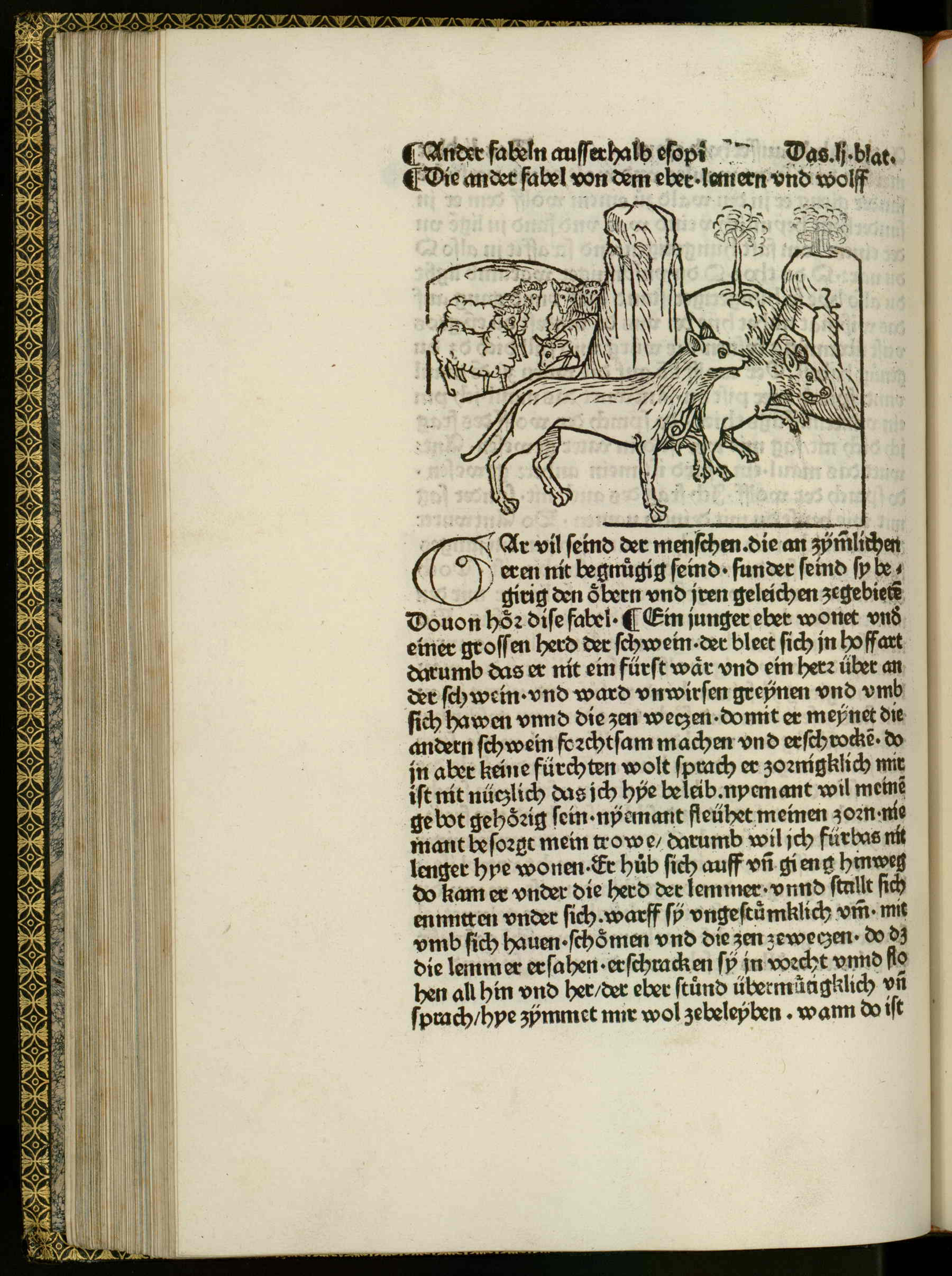 - At the bottom of the image there is a wolf and a hog walking towards the right. In the top left side of the image there are some sheep and a bull. On the top right corner of the image, there are hills and tree trunks.