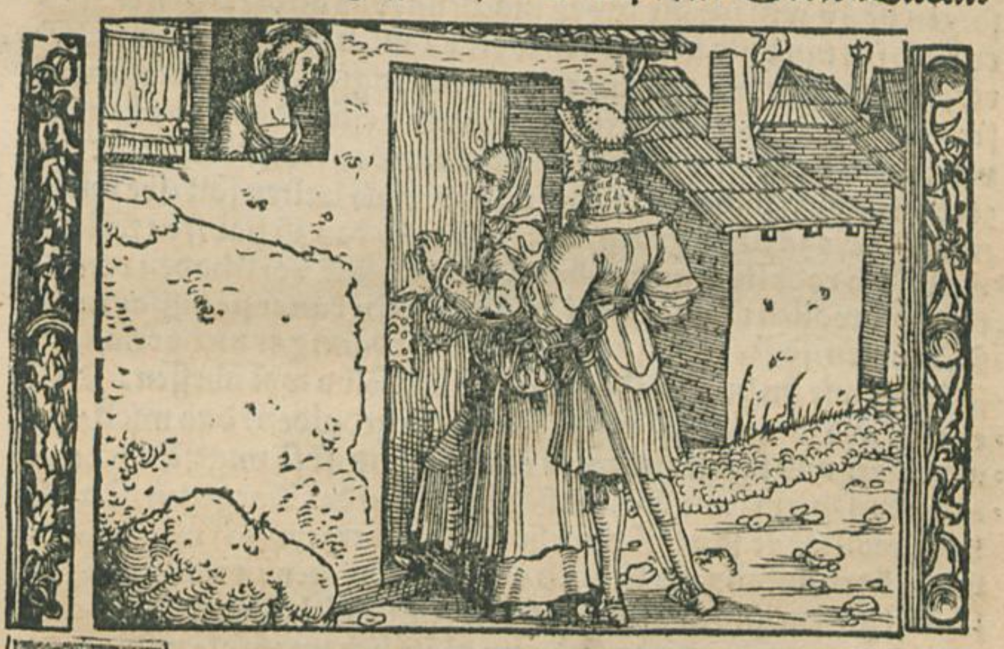 Sempronio (rightmost figure) arrives at the house of Celestina (central figure) and angrily chastises her for the slackness with which she is fulfilling Calisto’s request. She explains that she will be able to extract more compensation from Calisto if she takes her time. She asks him to join her in scamming Calisto, offering him an equal share of the profits and her prostitute Elicia (top-left corner, looking out from the window) in exchange for his loyalty. Sempronio readily agrees, and when Celestina departs for Melibea’s house, he stays behind to spend time with Elicia.