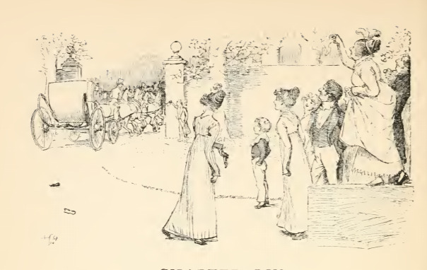 In this image the wedding carriage drives away from the Meryton church. Jane married Mr. Bingley on the same day Elizabeth married Mr. Bingley. Jane and Mr. Bingley moved into an estate near Pemberley shortly after their marriage. Here we see the wedding carriage as wedding guests stand on the steps outside the church and wave as the carriage leaves. This scene occurs in chapter 61. The characters are shown in the traditional regency style. The women wear regency dresses with empire waistlines. The men wear waistcoats and tailcoats. The regency period dated to the early nineteenth century (1811-1820) when George, Prince of Wales, later George IV (r. 1820-1830), reigned as regent for his mentally ill father, King George III (r. 1760-1820). The regency period is associated with the rise of neoclassicism in art and fashion.