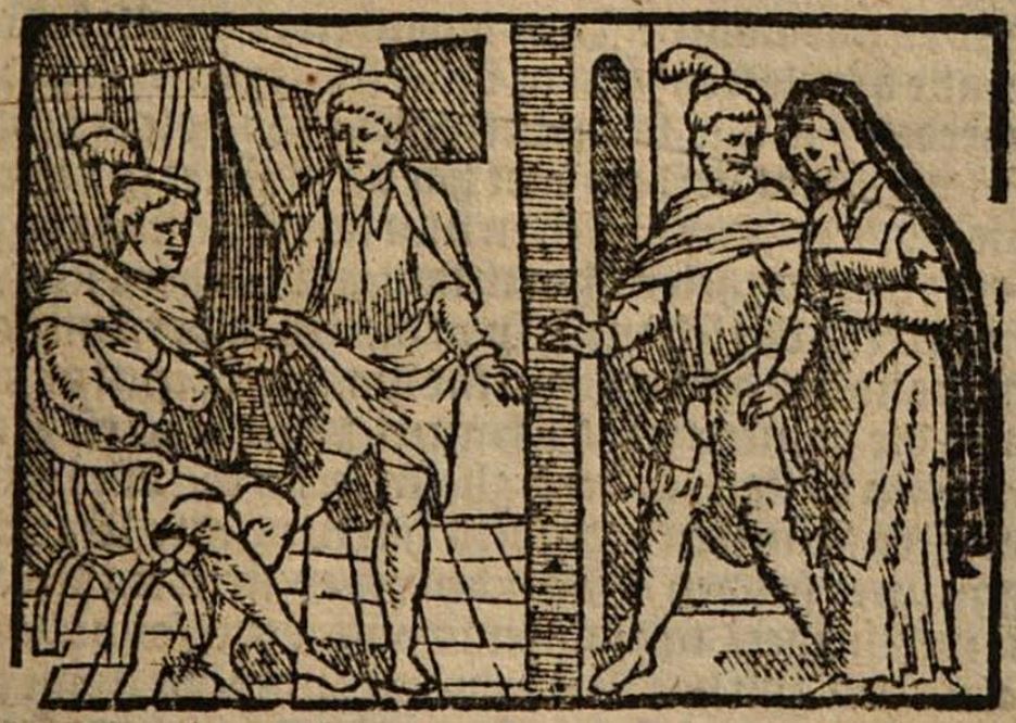 After Calisto (the leftmost figure) is rejected by Melibea during his first encounter with her, he finds himself in a state of discontent and despondency. His servant Sempronio suggests that he should employ the aid of Celestina (the rightmost figure, wearing a robe and a veil), a matchmaker and brothel owner. Calisto sends Sempronio to fetch her (they can be seen arriving at Calisto’s house to the right of the image). While Sempronio is away, Calisto talks with his other servant Pármeno, who unsuccessfully tries to dissuade him from procuring Celestina’s services (to the left of the image). The entire image is identical to the one found on page 86 of the text.