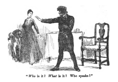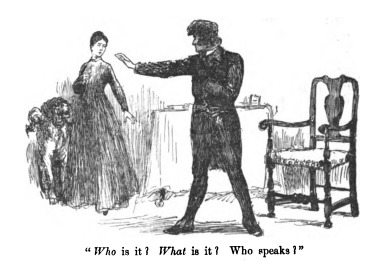 - Here Jane first sees Mr. Rochester after he was blinded by the fire. He did not believe it was her at first, wondering who was there. She came in to bring him his food, in place of his housekeeper. She stands near the table, with his dog, Pilot, next to her. Mr. Rochester stands with his hands held out in front of him, disoriented.