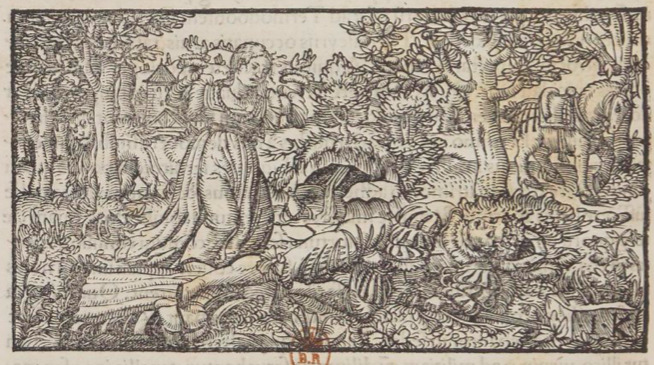 Thisbe and her forbidden lover, Pyramus, made plans to sneak out to see each other. After finding Thisbe’s cloak smeared with the blood of a lion, he assumed it to be her blood and that she was dead. He laid down on his sword to end his life, and before dying, Thisbe returned to find him almost dead. She, too, decided that she could not live without her lover, so she laid down on top of him and ended her life. They were tricked by fortune. In the photo, Thisbe is discovering her lover who is dying on the ground. In the background, the lion that tricked them is peering at them from behind a tree.