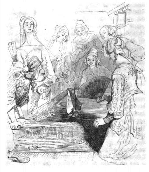 Here Gulliver sails on a boat made for him after telling the Queen about his travels. The Queen had a boat and a trough built for Gulliver to sail on and entertain the court. The trough is surrounded by the women of the court, all wearing long embroidered dresses with caps and veils. Some of the women hold fans, which was customary of court life in the eighteenth century. On the left-hand side, we see the Queen’s dwarf, looking angrily at Gulliver, resentful of all the attention Gulliver was getting. The same image appears in the 1843 Krabbe edition.