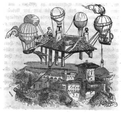 Here we see a scientist from the Grand Academy on Balnibarbi’s hypothesis for a new manner of construction. This scientist’s suggestion was to build the house from the top down, starting with the roof and ending with the foundation. The roof would be held up by balloons during construction. The scientist claims he was inspired by the building methods of spiders and bees. Gulliver was quite impressed with this idea unlike many other ideas he saw at the Academy. The same image appears in the 1843 Krabbe edition.