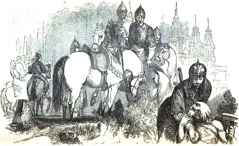 Rodrigo holds a leper whom he has found on the side of a road while en route to Santiago de Compostela. His companions on the journey, twenty hidalgos (nobles), sit on their horses in the background, while further back a city can be seen. Rodrigo later brings the leper to an inn and shares a supper and bed with him. In the night, the leper reveals that he is actually Saint Lazarus, and delivers a prophecy that Rodrigo will always be victorious in battle.