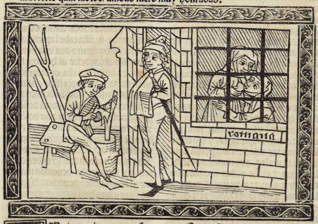 This engraving depicts a story of a young Roman woman who saved her mother from starving to death. Boccaccio explains that this unknown woman’s mother had been sentenced to death, and when she was locked away to die of starvation, her daughter saved her with her own breast milk. The girl and her mother are depicted behind the window of the jail cell as the mother drinks the milk of her daughter’s breast. The word “romana” is engraved below the jail cell window. The men that are standing guard outside the prison cell seem unconcerned and relaxed. They are unsuspecting of the young woman because they searched her every time she visited her mother and she never seemed to carried food with her. The young woman saved her mother’s life through her breast milk, and Boccaccio explains that he wrote on this unknown young woman due to her filial devotion.