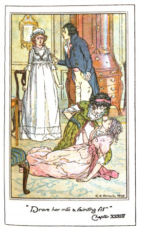 Here we see Mrs. Ferrars lying on the ground, held by her daughter, Fanny. Fanny and John Dashwood enjoyed Anne and Lucy Steele’s company, and invited them to stay for a few weeks with them in London. One day Anne announced that Lucy and Edward Ferrars were engaged. This shocked everyone, and Mrs. Ferrars fainted. Fanny became hysterical and told Lucy and Anne Steele that they had to leave immediately. Lucy Steele was not wealthy, and Mrs. Ferrars wanted Edward to marry a wealthy heiress, Miss Morton. After hearing the news, Mrs. Ferrars disowned Edward after he refused to break off the engagement. This scene appears in chapter 37 as indicated underneath the image. The characters are shown in the traditional regency style, with Mrs. Ferrars, Fanny, and Lucy wearing the regency style dress with an empire waist. Their hair is worn tied up, as was tradition for women after their “coming out” before the queen, signaling her entrance into society. Edward wears a waistcoat and tailcoat. The regency period dated to the early nineteenth century (1811-1820) when George, Prince of Wales, later George IV (r. 1820-1830), reigned as regent for his mentally ill father, King George III (r. 1760-1820). The regency period is associated with the rise of neoclassicism in art and fashion.