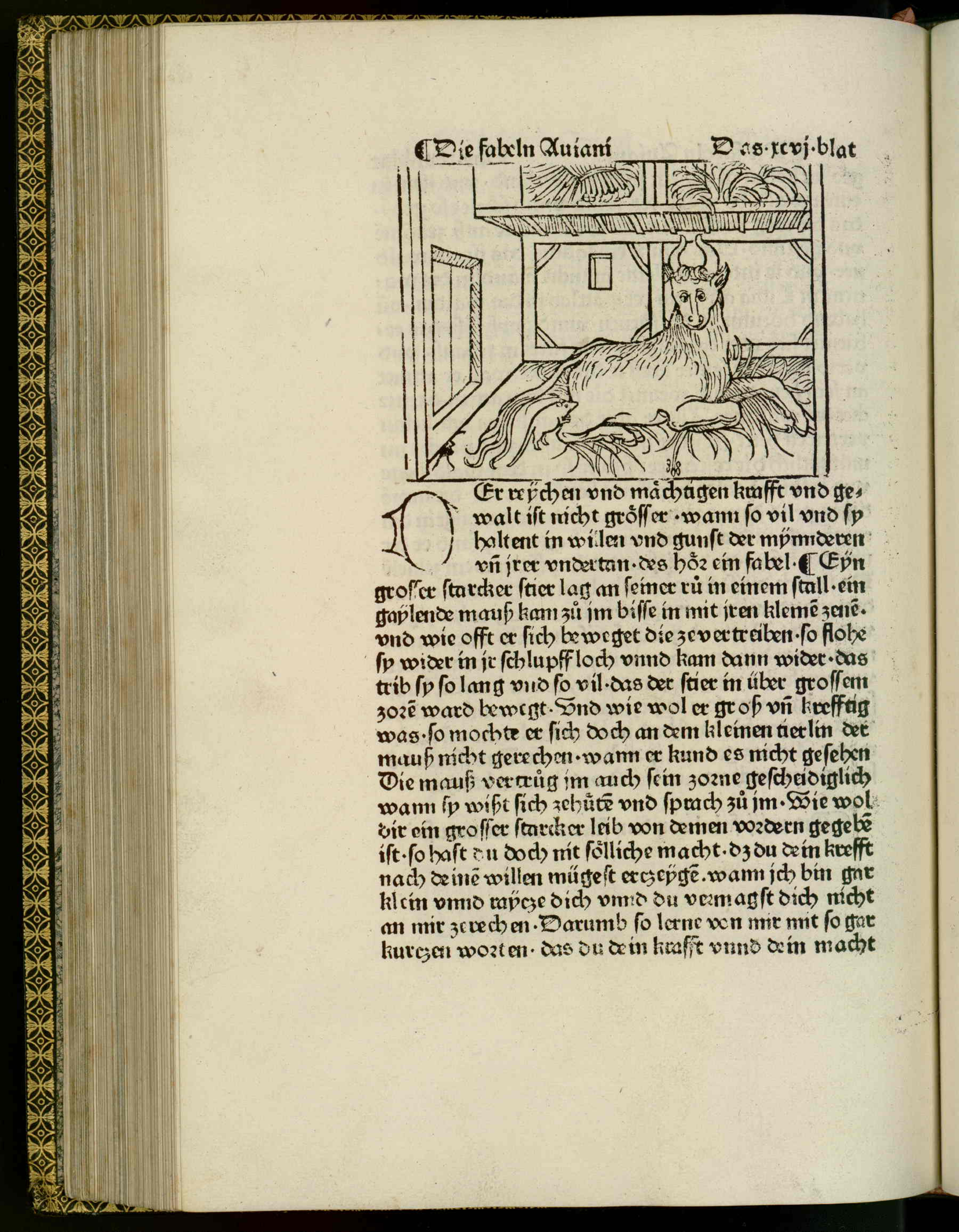 - An animal is laying down inside a farm house. Hay is around the animal while it is relaxed laying down.