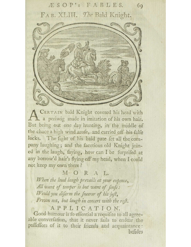 On the left stands a man on a horse, looking at a man on a horse in the middle, who is throwing his wig and hat, showing his bald head. On the right, a man on a horse going down a hill is stopped, turning back to look at the bald man in the middle. The middle man's horse is slightly up on its hind legs, appearing as if it is about to jump.
