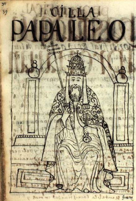 This illustration depicts Pope Leo III sitting on his pontifical throne. He is illustrated wearing the papal tiara and a long staff that has three horizontal bars at the top, which symbolizes pontifical power. Felipe Guaman Poma de Ayala spends this section of his manuscript listing off approximately the first 200 popes, and Pope Leo III was one of the few that was illustrated.