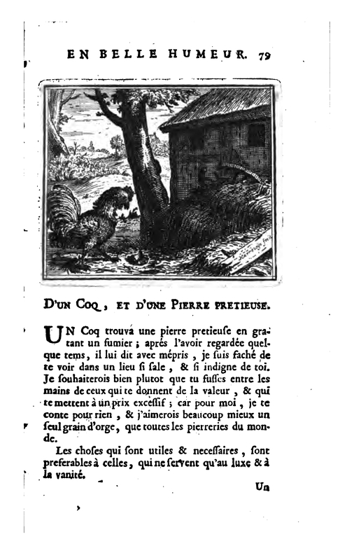 - The image depicts a cock in a farmyard who has found a precious jewel while scratching in the farmyard. The cock has no use for a precious jewel and would prefer a grain of barley.