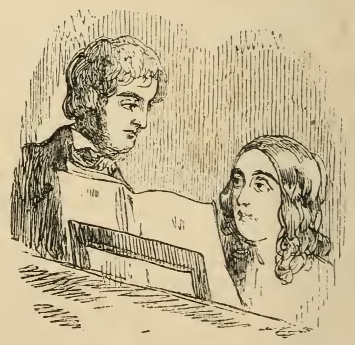 George Osborne and Amelia Sedley are seated at the piano, gazing at each other, with a book of sheet music open in front of them.