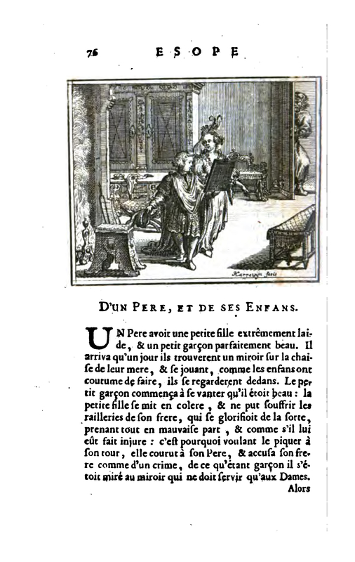 A father had a little girl who was extremely ugly, and a little boy who was perfectly beautiful. It happened that one day they found a mirror on their mother's chair, and playing, as children are will do, they looked at themselves in it. The little boy began to boast that he was handsome: the little girl became angry, and could not bear the mockery of her brother, who boasted of her strength, taking everything in the wrong way, and as if he had done her an injustice: This is why, wanting to prick him in his turn, she ran to her father and accused her brother of a crime, because, being a boy, he was looking at the mirror which should only be used by the ladies.